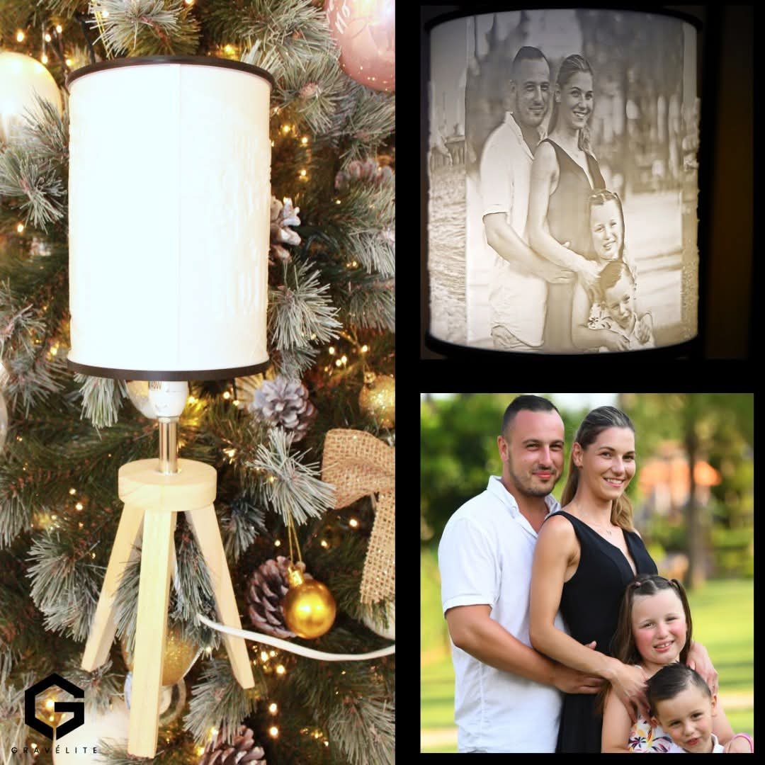 Son abat-jour en lithophanie est imprimé à partir de vos photos : lorsqu’elle s’allume, les images prennent vie grâce au relief et à la lumière.
